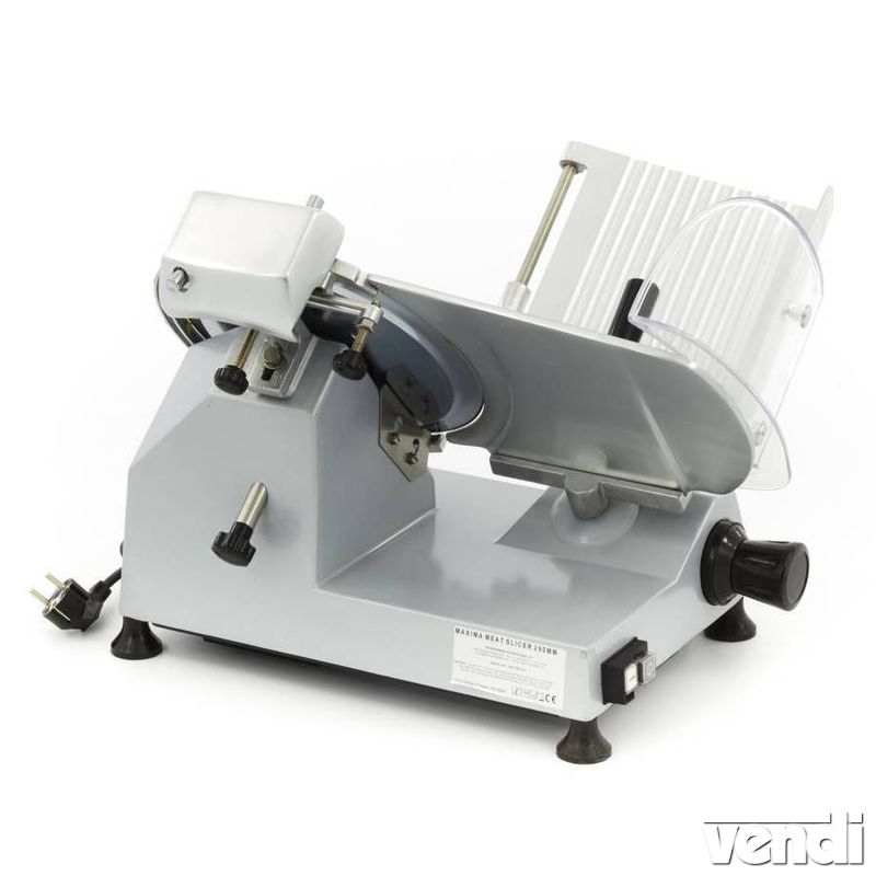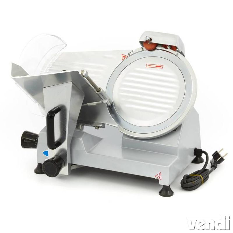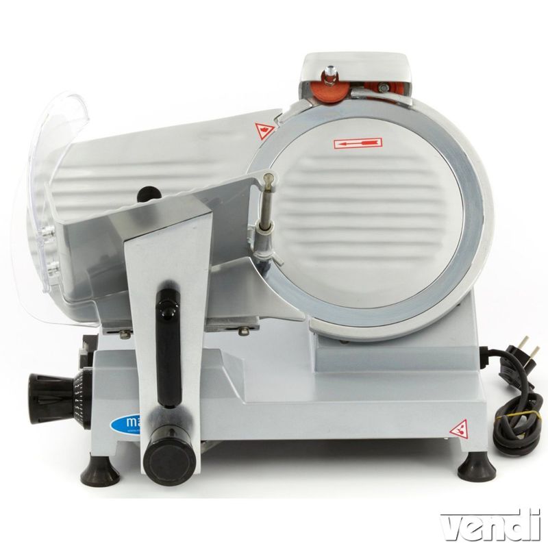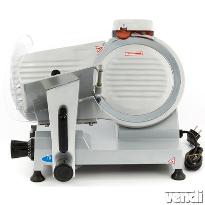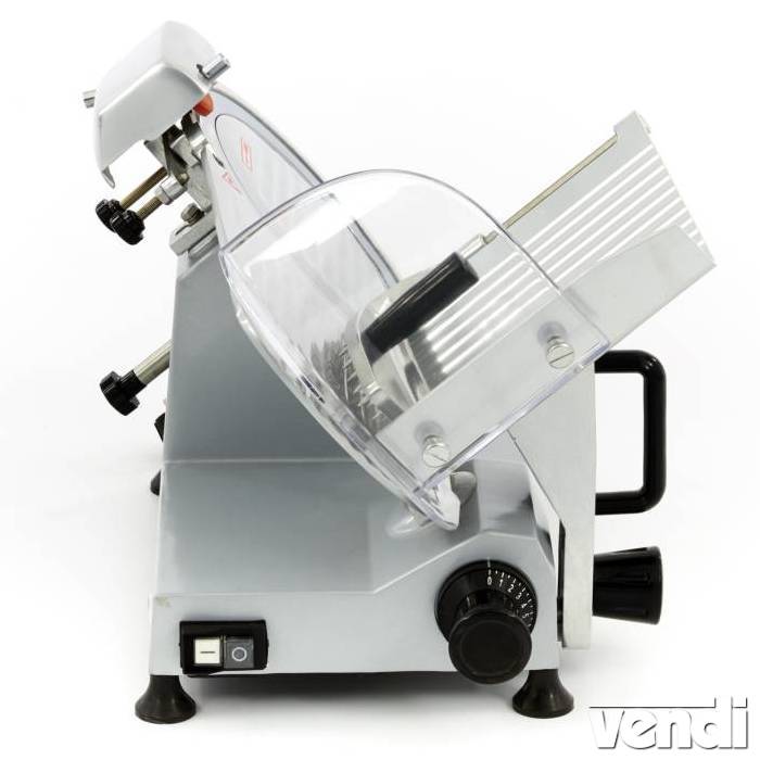 Felvágottszeletelő, döntött késű, 250 mm-es pengeátmérővel. Masszív, alumínium testtel rendelkező szeletelőgép, rozsdamentes acél pengével. Kés sebesség: 300 RPM. Állítható szeletvastagság 0-12 mm közt (Ajánlott minimális szeletvastagság: 1 mm). Maximális vágóvastagság: 180mm. Késélező szerkezettel. Kifejezetten csendes készülék. Gumitalpak. Könnyen tiszítható felvágottszeletelő készülék.
