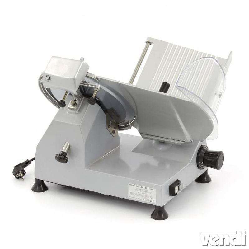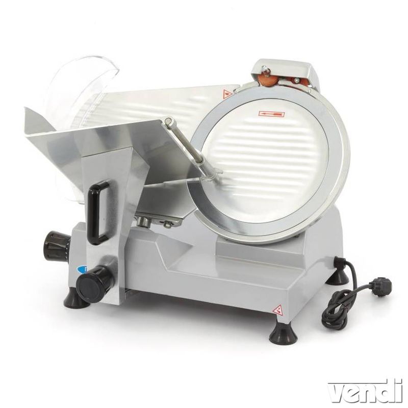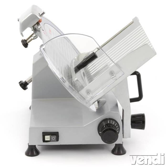Felvágottszeletelő, döntött késű, 300 mm-es pengeátmérővel. Masszív, alumínium testtel rendelkező szeletelőgép, rozsdamentes acél pengével. Kés sebesség: 265 RPM. Állítható szeletvastagság 1-12 mm közt (Ajánlott minimális szeletvastagság: 1 mm). Maximális vágóvastagság: 21 cm. Késélező szerkezettel. Kifejezetten csendes készülék. Gumitalpak. Könnyen tisztítható felvágottszeletelő készülék.