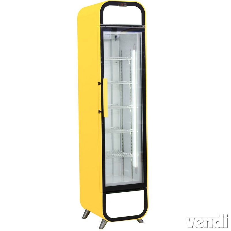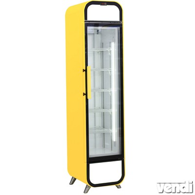 Üvegajtós függőleges palackhűtő szekrény keskeny kivitel, ventilációs hűtéssel, 181 literes. KIS ESZTÉTIKAI HIBÁVAL: az ajtó felső szélén apró festék megfolyás látható! Hűtővitrin 5 db szinterezett állítható huzalrács polccal. Reklámfelépítmény és árutároló tér világítással. Porszórt acél külsővel és festett aluminium belsővel. Mechanikus hőfokszabályozással és hőmérővel. Két rétegű nyíló ajtós, erős lábakon álló kivitel. Olvadékvíz elpárologtatóval rendelkezik. 2,5 kW/24 óra elektromos fogyasztással! R-290 hűtőgáz. Hűtési hőmérséklet 0/+10°C, 25-38 °C környezeti hőmérséklet és 60% levegő páratartalom esetén! Oldalak és világító frontfelület kiválóan alkalmasak reklámhordozó grafika elhelyezésére! Sárga színben. (A készülék színárnyalata a megvilágítástól, monitorbeállításoktól függően a valóságban eltérhet)