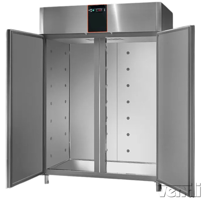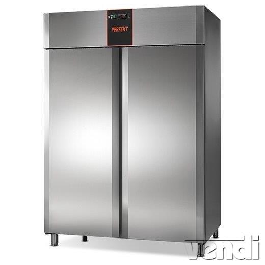 Fagyasztószekrény, rozsdamentes, 1400 literes, GN2/1 belmérettel. Bruttó/nettó űrtartalom: 1400/909 liter. Kívül-belül rozsdamentes acél kivitel (A készülék aljának, hátlapjának és tetejének külső borítása galvanizált acél kivitelű). 60mm vastag hőszigetelés. Ventilációs hűtési rendszer. Önbecsukó ajtó. Mágneses ajtótömítés. Belső világítás. Digitális vezérlőpanellel. Automatikus leolvasztással és kondenzvíz elpárologtatással. Hűtési tartomány: -18/-22 °C. Hűtőközeg: R452A. A hűtési paraméterek +30°C és 60% levegő páratartalom esetén érvényesek. Alaptartozék 6 db GN//1 méretű állítható műanyagbevonatú rácspolccal. Energiafogyasztás: 5342 kWh/év. Energiahatékonysági osztály: E.