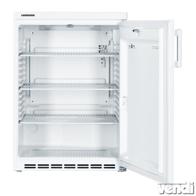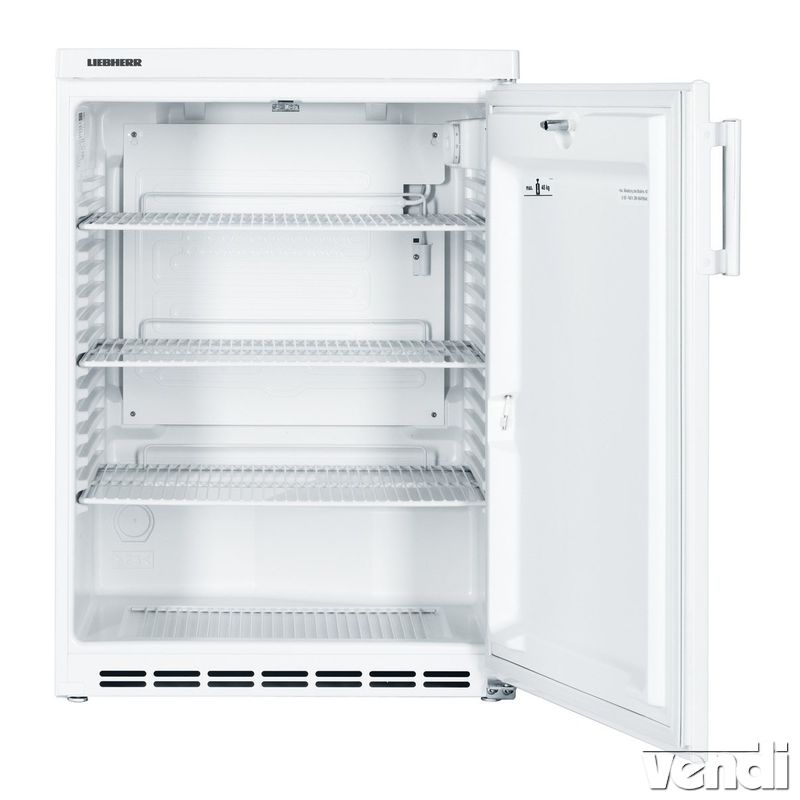 Pult alatti hűtőszekrény, festett fehér, 180/160 literes bruttó/nettó űrtartalom - Liebherr FKU 1800. pult alá helyezhető hűtőszekrény; statikus hűtési rendszer; zárható HardLine teli ajtó; belső, oldalsó világítás; hűtési tartomány: +2/+10°C között; mechanikus vezérlés; digitális hőmérsékletkijelzés; kívül fehér színű porszórt acél burkolat; egy darabból öntött polisztirol (környezetbarát) belső burkolat; 3 db fehér színű védőbevonatos acél rácspolc; padlórács; a polcok magassága 35 mm-ként állítható; polconkénti terhelhetőség: max. 50 kg; az ajtó nyitásának iránya megfordítható; higiénikus, cserélhető ajtószigetelés; automatikus leolvasztás; 1 pár első vízszintező talp; FCKW-FKW mentes hűtőközeg (R 600a) és falszigetelés; külső hőmérséklet: +10/+32°C között - 4. klímaosztály; energiafelhasználás 24h alatt: 0,698 kWh. 5 év Liebherr gyári garancia.