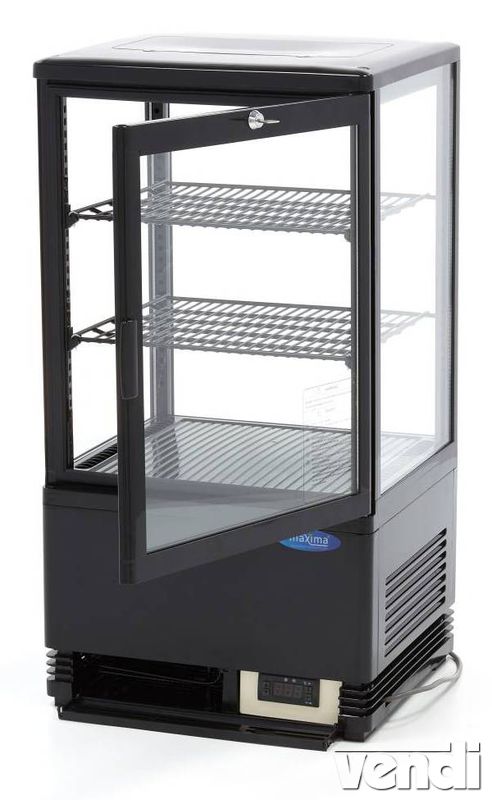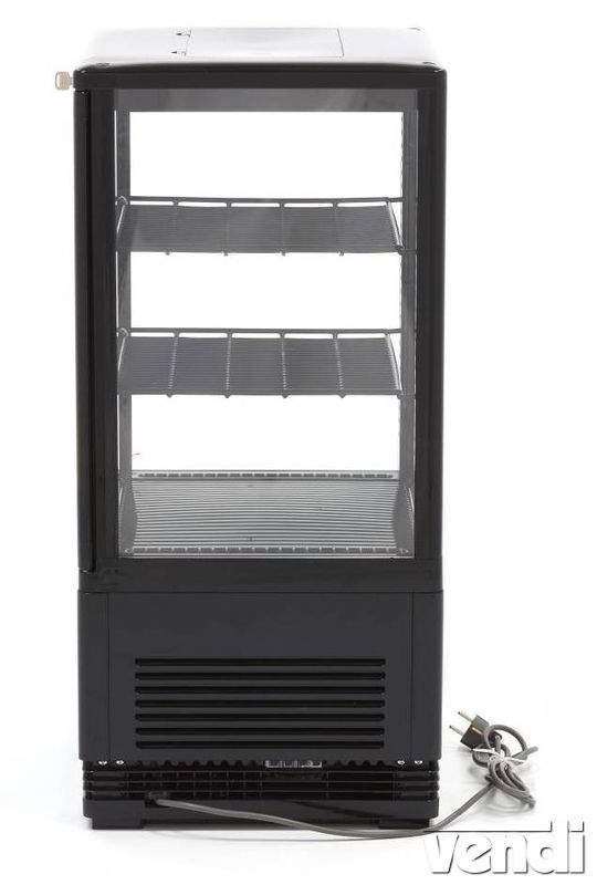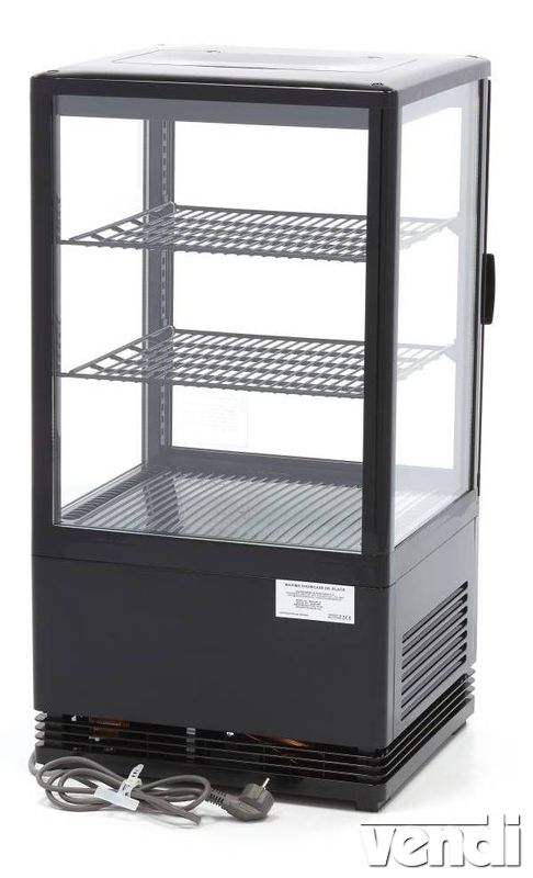 Hűtővitrin, pultra helyezhető, sík üveges, 58 literes, fekete. 4 oldalról üvegezett, egyik oldalon zárható nyíló ajtóval, árumegvilágítással. 2 álltható rácspolccal. Ventilációs hűtéssel. Hűtéstartomány: +4/+12°C. Hűtőgáz típusa R600A. A hűtési paraméterek, +16/+25°C és 60% levegő páratartalom esetén érvényesek. A berendezést elsősorban már lehűtött termékek bemutatására javasoljuk! Legyen figyelemmel a készülék elhelyezésénél a klimatikus viszonyokra és a berendezés szellőzésének biztosítására, mert a környezeti körülmények és a gyakori ajtónyitások a berendezés hűtési hőmérsékletét erősen befolyásolhatják! Energiafogyasztás: 1014 kWh/év. Energiahatékonysági osztály: B.