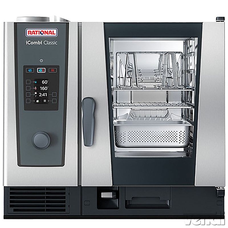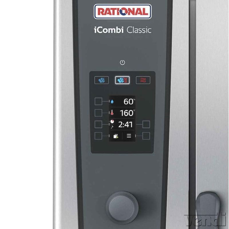 Rational iCombi Classic 6-1/1 E elektromos kombi sütő pároló. 6xGN1/1 tálca férőhelyes. Napi 30-100 adag kapacitás. Nagyteljesítményű gőzgenerátorral: hatékony gőzképzés még 100°C alatti alacsony hőmérsékleten is. Rozsdamentes acél (DIN 1.4301), varrat nélküli, lekerekített sarkú és optimalizált légáramlású higiénikus sütőtér. Aktív klímakezelés a sütőtérben, a páratartalom 10%-os lépésközönként állítható. Dinamikus légáramlás a sütőtérben, 5 állítható ventilátorsebességgel. Hőmérséklet beállítási lehetőség 30-300°C között. Kombigőzölés a következő üzemmódokkal: Gőz 30-130°C, forró levegő 30-300°C, gőz és forró levegő kombinációja 30-300°C. Maghőmérő 1 pontos méréssel. Delta-T sütés funkció nagy húsdarabok kímélő elkészítéséhez. Lehűtő funkció a sütőtér gyors lehűtéséhez. 4,3 hüvelykes méretű színes TFT kijelzővel, egyértelmű szimbólumokkal. Egyszerű vezérlés nyomógombokkal, központi tekerőgombbal. Hang- és vizuális jelzés, ha a felhasználói beavatkozás szükséges. Digitális hőmérséklet illetve páratartalom kijelzés: a pillanatnyi érték és a célérték megjelenítése. Programozható kivitel: 100 program, mely akár 12 lépésig szabadon programozható. Energiatakarékos, hosszú élettartamú LED sütőtér megvilágítás. Automata tisztítórendszer a sütőtér és a gőzgenerátor számára. 4 különböző tisztítási program. Felügyelet nélküli tisztítás lehetősége akár éjszaka is. Beépített kézi zuhany, automatikus visszahúzó rendszerrel. Könnyen tisztítható külső rozsdamentes acél és üveg felületek, IPX5 védettség (vízsugár elleni védelem). Kétrétegű sütőajtó hátsó szellőzéssel, speciális hő visszaverő bevonattal és elfordítható belső panelekkel az egyszerű tisztítás érdekében. Beépített, IP-védett USB interfész helyi adatcseréhez. A kombipárolóhoz állvány, vízlágyító, tepsi, egyéb kiegészítők külön rendelhetőek. 2 év teljes körű gyári garanciával.