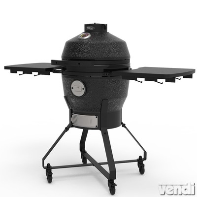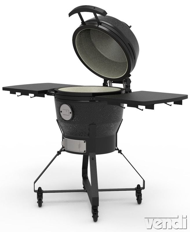 Kerámia grill (tojásgrill), álló kivitel. Sütőtér átmérője: 39,5 cm. Grillrács átmérője: 37,5 cm. Kültéri faszenes tojás alakú barbeque grillsütő kerámia burkolattal. Zománcozott acél sütőráccsal. Átforrósodás ellen védett fogantyúkkal. Beépített analóg hőmérővel. Állítható alsó és felső szellőzőnyílás biztosítja a megfelelő légáramlást. Álló kivitel festett acél állványzattal, kerekekkel, lehajtható oldalsó bambusz polcokkal. Alkalmas hagyományos és barbeque grillezésre, lassú sütésre, füstölésre, kemencés stílusú ételek sütésére. Alaptartozékok: deflektor (hőhatároló) kő, egészcsirke tartó, füstölő betét faforgácsos füstöléshez, takarófólia, rácsfogó csipesz, tisztítókefe, hamukaparó eszköz.