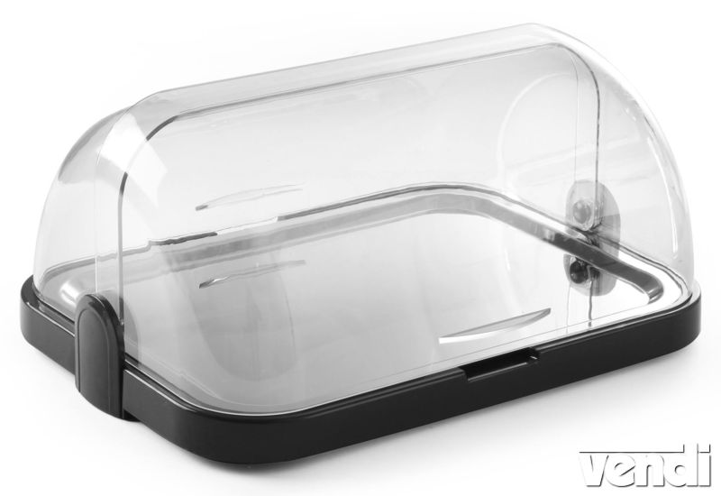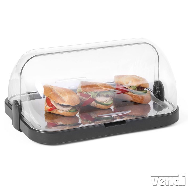 Hűthető bemutató tálca, (frissentartó büfé búra) roll-top tetővel, 440x320mm, 2 db jégakkuval. Egyszintes, műanyag kivitel, 350x250mm méretű rozsdamentes acél tálcával. ABS műanyag alsó résszel, SAN műanyag átlátszó műanyag búrával.