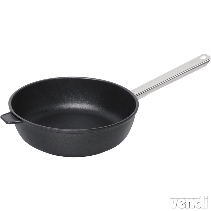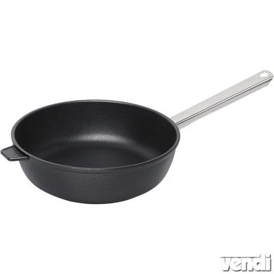 Öntött alumínium mély serpenyő, titánium tapadásgátló bevonattal, O280mm. Kifejezetten gyors felmelegedési idővel. Rozsdamentes acél (18/10) nyéllel, mely nem melegszik át. Indukciós tűzhelyen NEM használható! Mosogatógépben mosható.